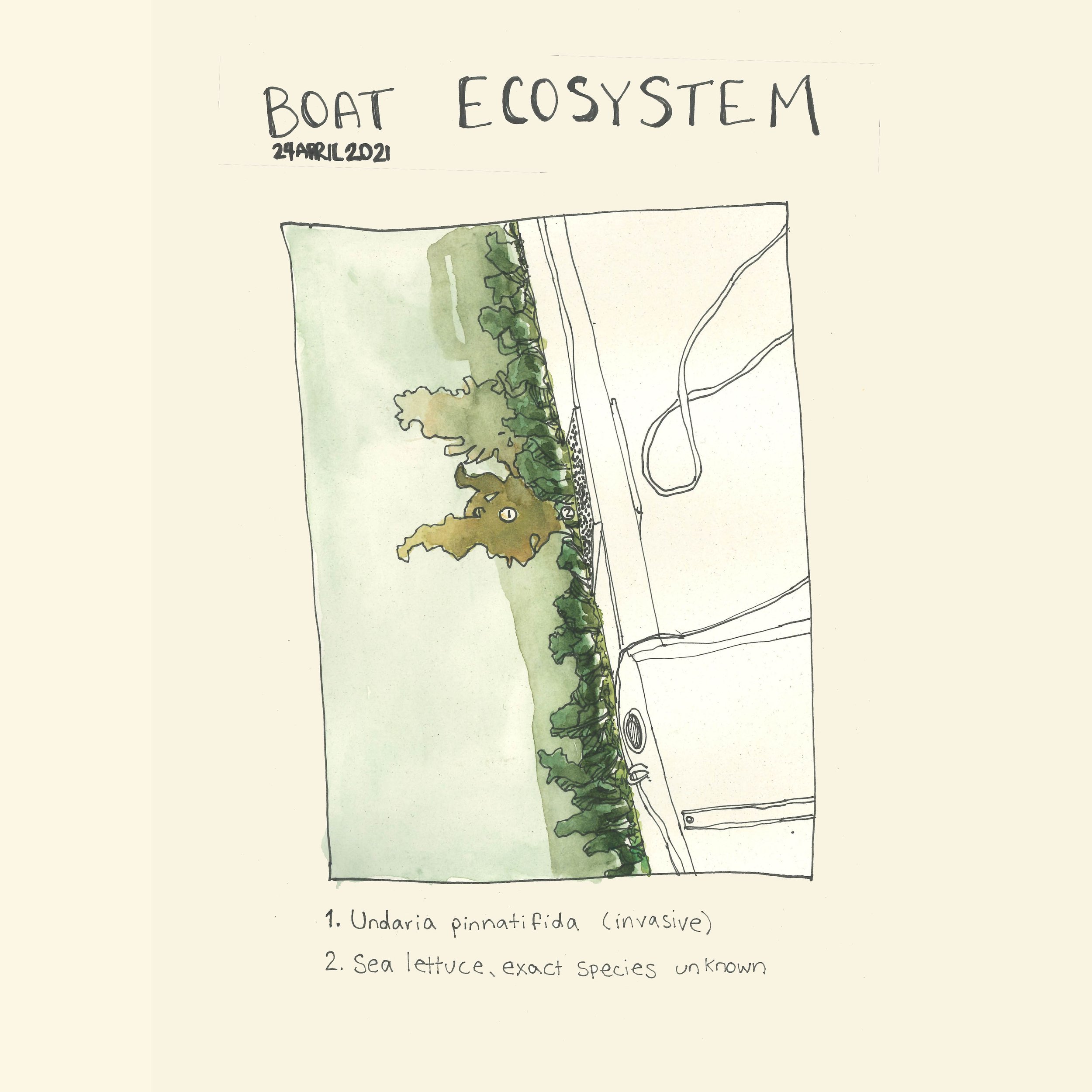 Through site drawings, species mapping, and material prototyping, Larsen documented how invasive algae colonize stone steps, boat surfaces, and intertidal ecologies. She later transformed harvested wakame into a form of “seaweed leather,” exploring its potential as a locally sourced, regenerative design material.