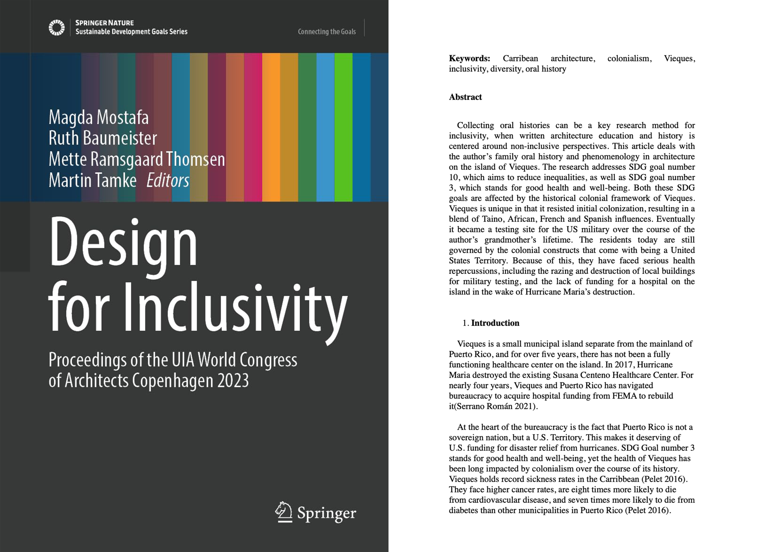 “The Time Capsule: Memories of Viequense Architecture” was published in Design for Inclusivity: Proceedings of the UIA World Congress of Architects Copenhagen 2023 (Springer Nature). Peer-reviewed and selected for the congress’s scientific programme, the chapter uses oral history and phenomenological research to examine how colonial governance, healthcare inequities, and intergenerational memory shape the architectural identity of Vieques, Puerto Rico. The work contributes to global discourse on inclusive heritage practices, spatial justice, and decolonial methodologies in architecture.
