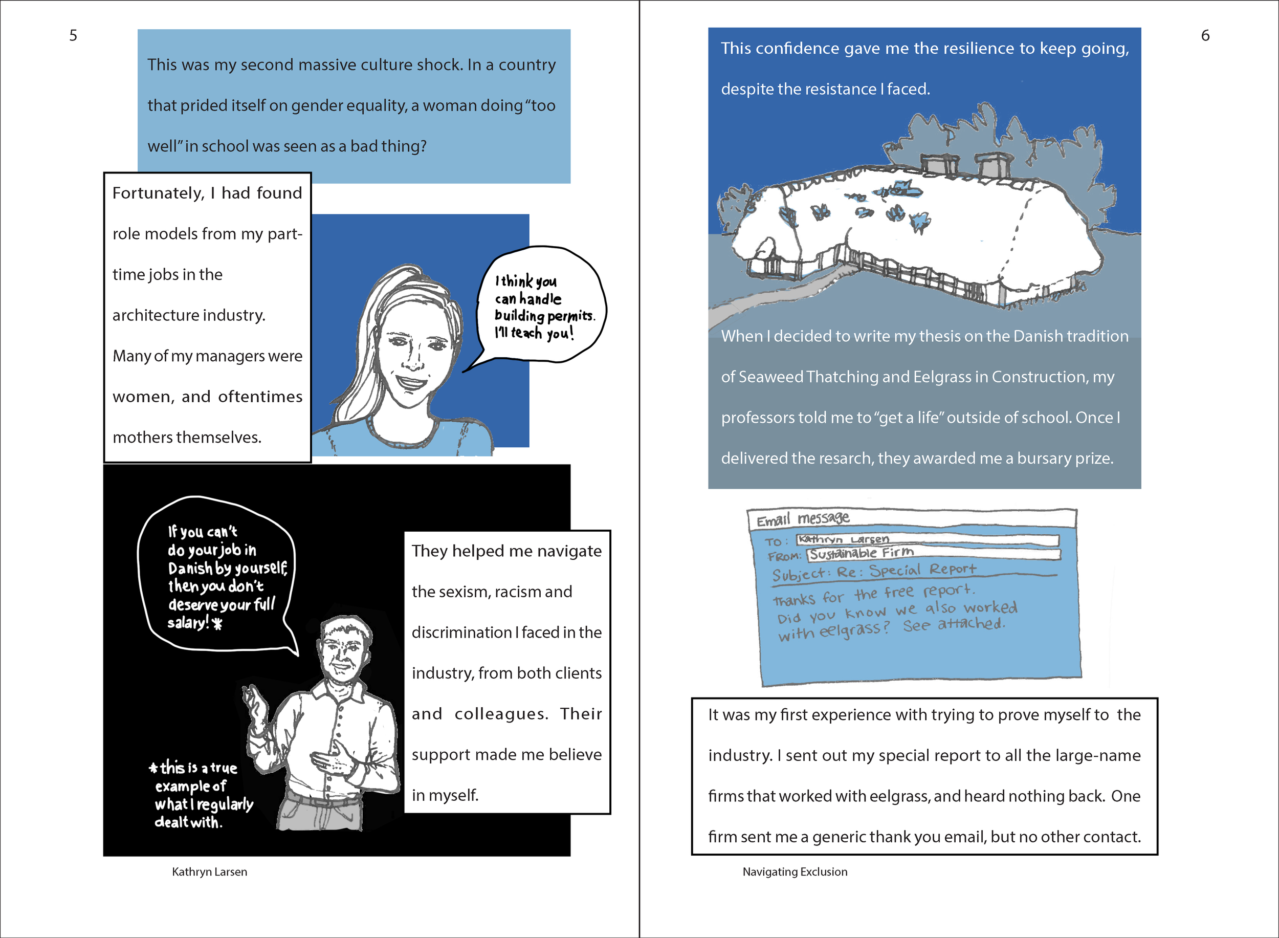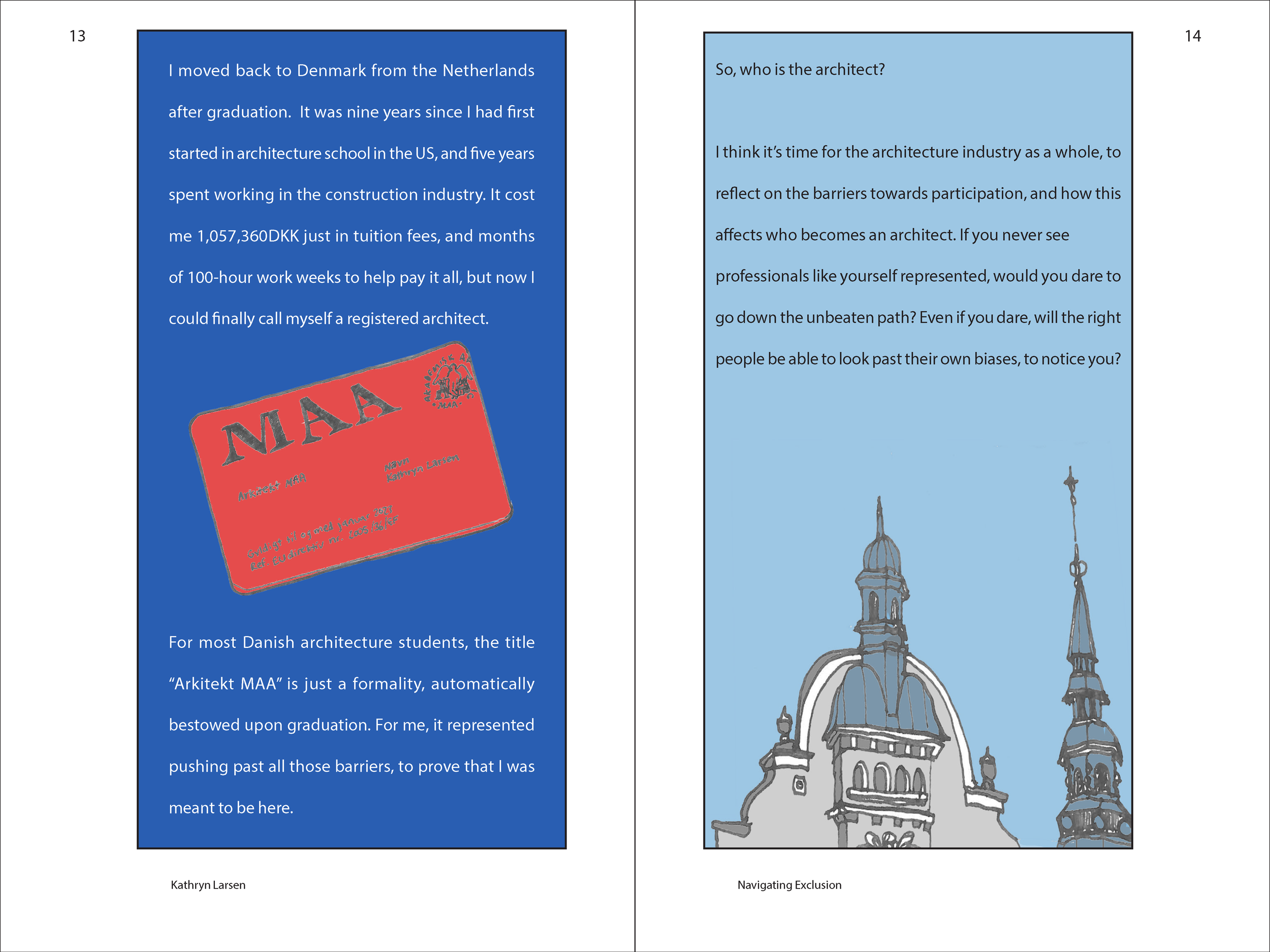 Navigating Exclusion is a sixteen-page illustrated essay tracing Kathryn Larsen’s journey across the U.S., Japan, Denmark, and the Netherlands to become an architect - and the barriers she encountered along the way. Through graphic storytelling, the chapter examines the narrow and often exclusionary definitions of who can be recognised as a “real” architect, artist, or designer within the Danish architectural system. Originally published in Who is the Architect?, a book by Building Diversity (2023)